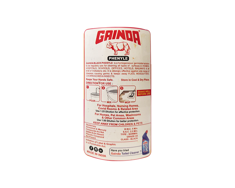 GAINDA Black Disinfectant Fluid is highly bactericidal and effective against a wide range of bacteria, fungi and viruses. It is a powerful disinfectant for cleaning toilets, drains, floors, etc. in households, hospitals, government organizations and industries. It is very effective under strong organic pollution and leaves a strong odor.