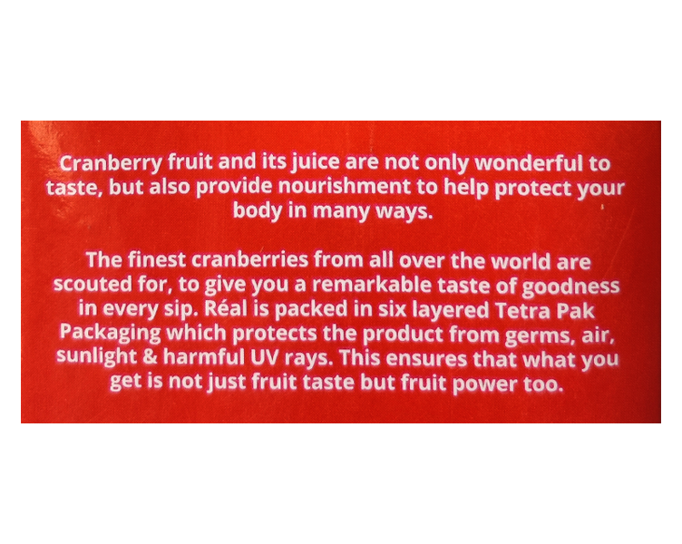 Réal Fruit Power Cranberry is the most popular and loved cranberry fruit beverage in the country. It has been well accepted as the most preferred base for many delightful mocktails (like cranberry fruit punch) and has in fact, become the key to creating magic at home! Juice of Cranberry is loved for its taste which leaves you wanting for more. Most of us love to have chilled cranberry juice in summers as refreshment and like to make mocktails round the year for fruit-filled fun and variety.