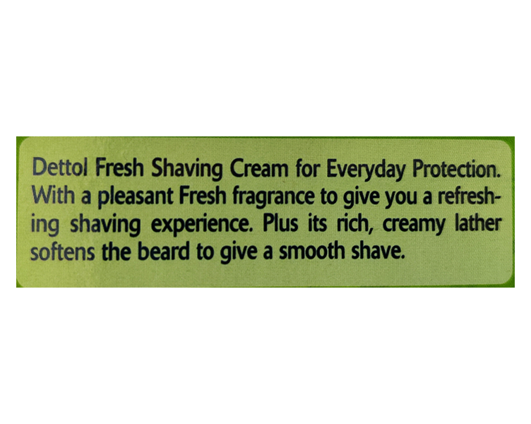 Dettol Shaving Cream Fresh serves as a protective cushion between the razor and the skin, for a closer shave without irritation; helps in nourishing and moisturizing your skin and softens the beard for smooth shave