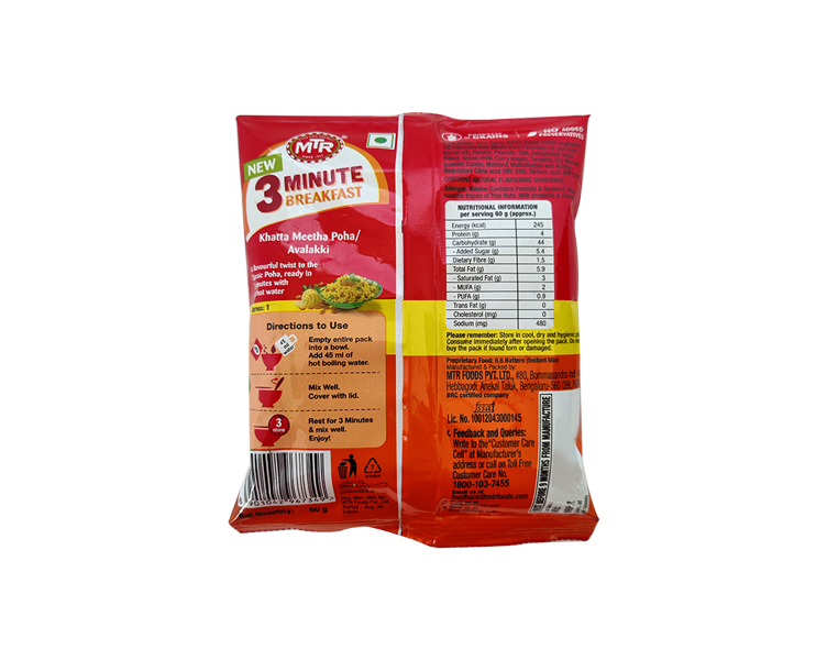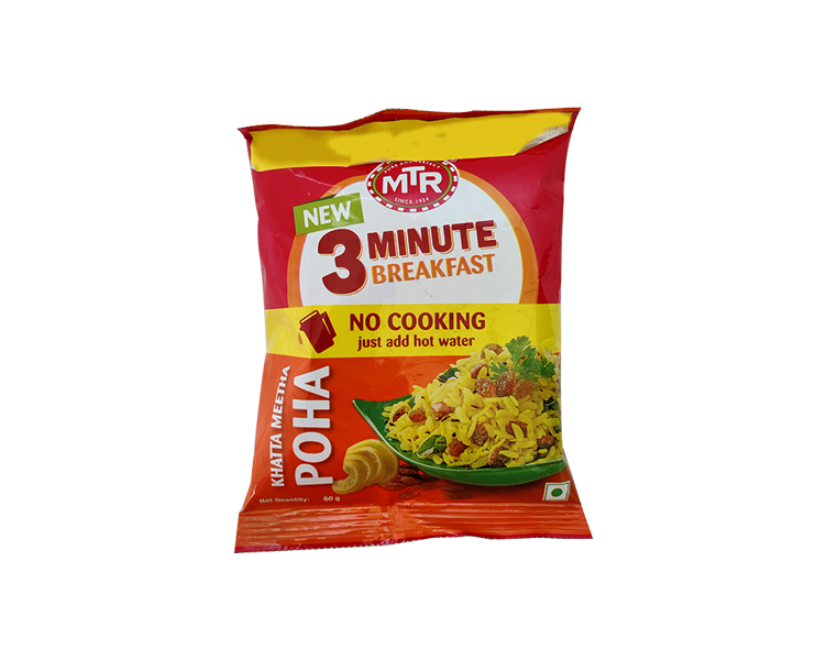 MTR Poha is a wholesome & top notch breakfast, prepared in 3 minutes with hot water. Make your mornings simpler with MTR Poha. Enhanced with crunchy peanuts and a sprint of Lemon, MTR Poha is accessible in two scrumptious flavors: Regular and Khatta Meetha.
