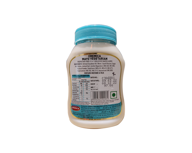 Cremica Mayonnaise is a classic sandwich spread that has a thick, White, Smooth with slight Sheen, Creamy homogeneous texture. It is available in different flavours that are ideal to be used for preparing salads, sandwiches and pasta. Store in a cool and dry place.