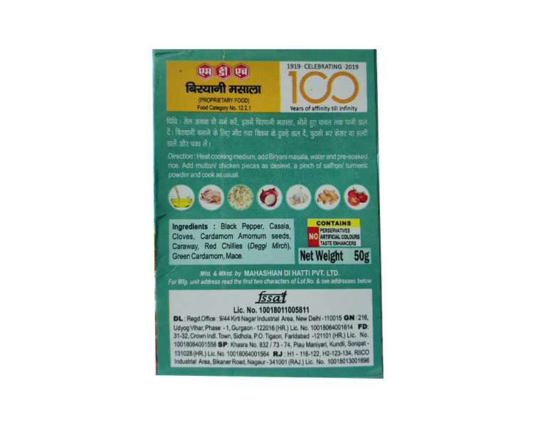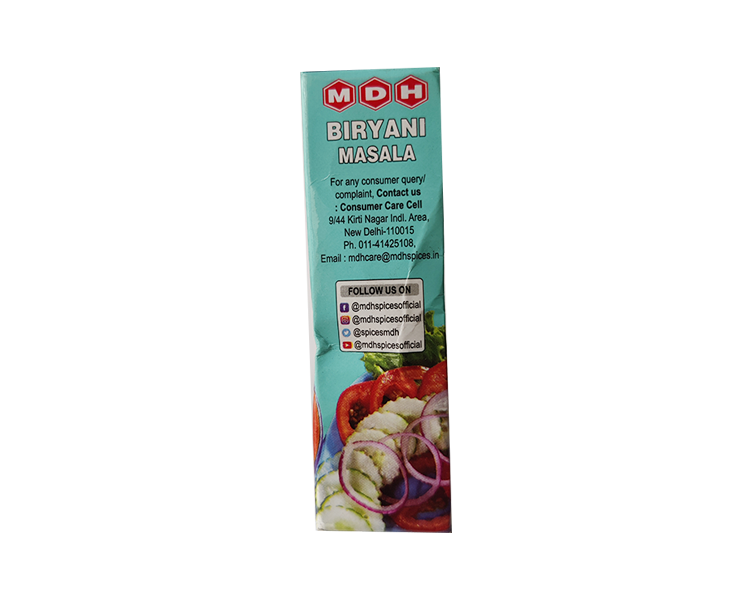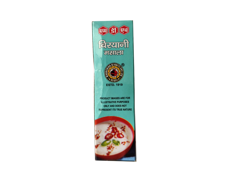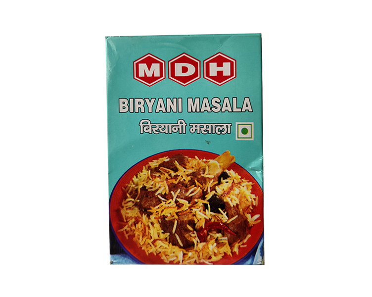 MDH Biryani Masala is a spice blend for mutton biryani. Made with cinnamon, black peper, cardamom seeds, red chillies, cloves, caraway, cardamom green and mace.