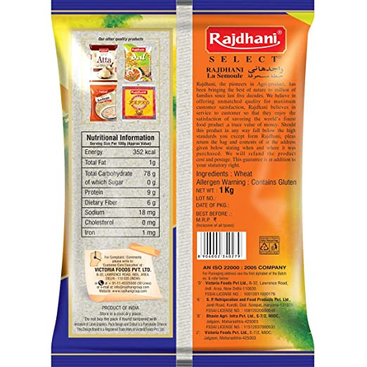 Rajdhani Sooji is made from high quality durum wheat. Sooji is also known as semolina or rava. It is one of the basic components of the Indian diet. It has a sweet nutty flavor and an earthy aroma.
