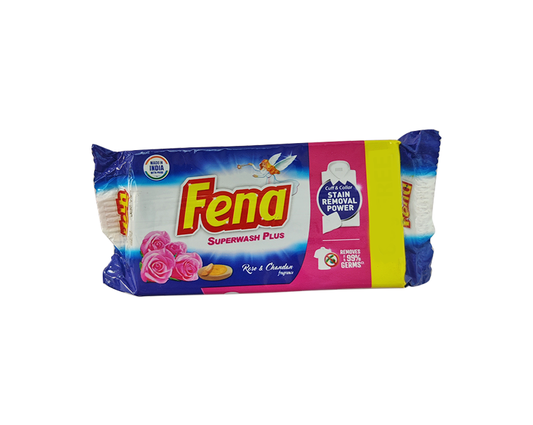 Fena Superwash Plus Detergent Cake' designed to give you a premium washing experience with Rose & Chandan perfume, dirt and stain removing active ingredients & optical brightener for dazzling whiteness.