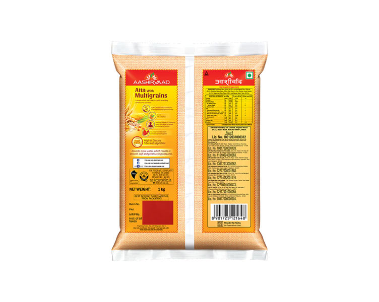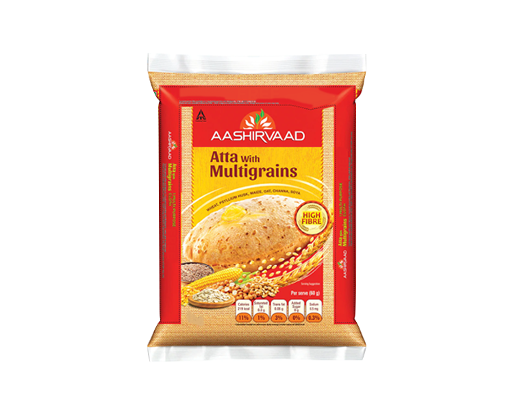 AASHIRVAAD Multigrain Atta contains a complex blend of six natural grains. Numerous health benefits are unlocked with AASHIRVAAD Multigrain Atta, which is made of wheat, soya, corn, psyllium husk powder, oats, and Bengal gram flour. This Multigrain Atta from AASHIRVAAD is rich in dietary fibre, proteins, and vitamins.