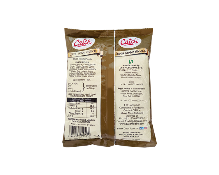 Catch Super Garam Masala is an exquisite blend of rich and premium Indian spices. It adds amazing flavour, aroma and colour to any gravy/curry. Catch Super Garam Masala is perfect for Indian-style curries. Super Garam Masala can be used across any Indian cuisine for a powerful punch of spiciness.